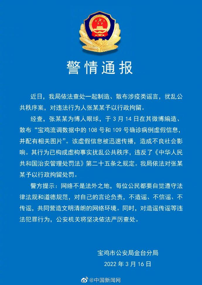 10.造谣宝鸡姐弟病例关系者被行拘:近日,陕西宝鸡市警方依法查处一起制造、散布涉疫类谣言,扰乱公共秩序案,对违法行为人张某某予以行拘。经查,张某某为博人眼球,编造、散布宝鸡流调数据中的108号和109号确诊病例虚假信息并配有相关图片,造成不良社会影响。经调查核实,二人为孪生姐弟关系。(陕西新闻网)