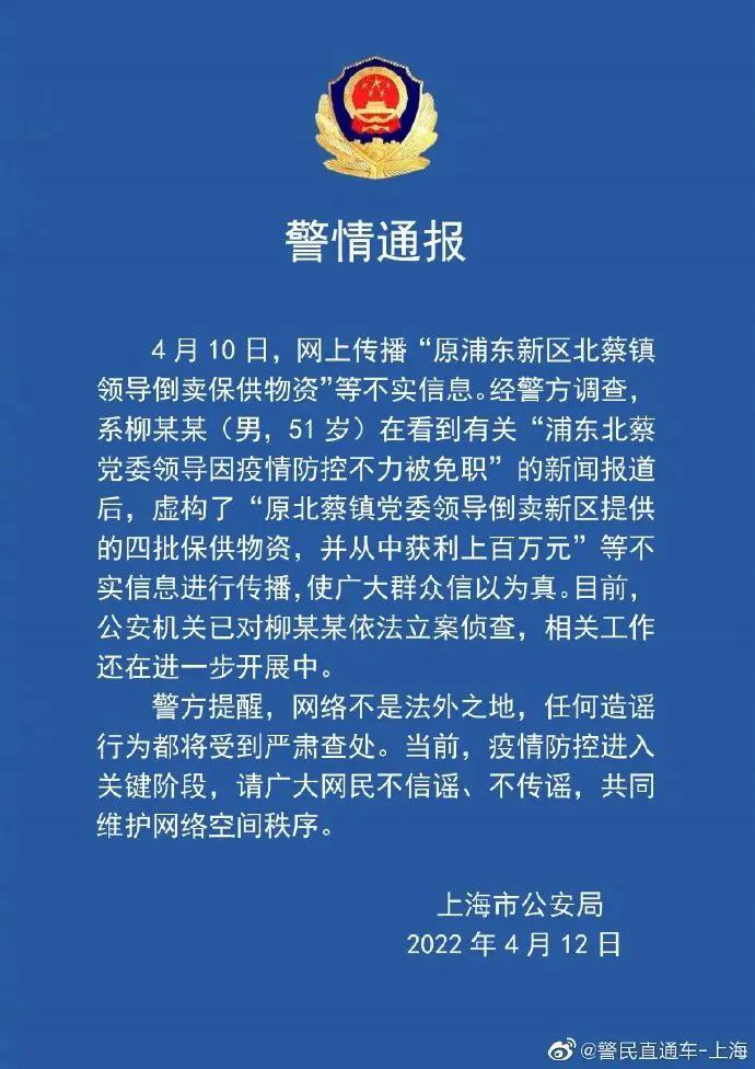 5.男子造谣上海一领导倒卖保供物资被立案侦查:近日,网传“原上海浦东新区北蔡镇领导倒卖保供物资”等信息,引发关注。12日,上海警方通报,经查,系柳某某(男,51岁)在看到有关“浦东北蔡党委领导因疫情防控不力被免职”的报道后,虚构不实信息进行传播。目前,公安机关已对柳某某依法立案侦查。(正义网)