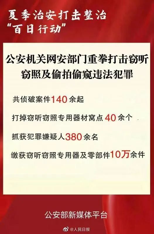 3.重拳出击!公安缴获窃听窃照器材10万余件:全国公安机关网安部门结合夏季治安打击整治“百日行动”,依法严打非法生产、安装、控制网络摄像头等窃听窃照器材及偷拍偷窥违法犯罪。截至目前,共侦破案件140余起,抓获嫌疑人380余名,缴获窃听窃照专用器材及零部件10万余件,坚决斩断制售窃听窃照专用器材及偷窥偷拍违法犯罪黑色产业链条。(人民日报)