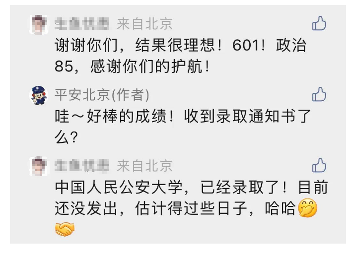 6.续集来了!北京民警帮助过的学生被公安大学录取:今年高考期间,北京一考生丢失身份证,紧急时刻,民警及时帮忙补办证件,之后该考生留言对民警表达感谢。近日,这位同学向北京市公安局官方微博@平安北京 报喜,称自己以601分被中国人民公安大学录取。网友留言:有种传承的味道,进入循环了!(北京日报)