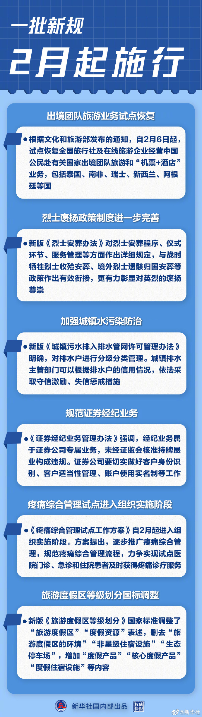 1.一批新规2月起施行:试点恢复出境团队旅游业务、烈士褒扬政策制度进一步完善、加强城镇水污染防治、推广疼痛综合管理……看一看哪一条你最关心?(新华社)