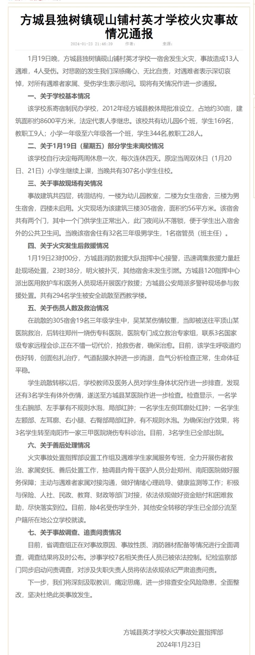 19日晚,河南方城县独树镇砚山铺村英才学校一宿舍发生火灾,事故造成13人遇难,4人受伤。23日晚,方城网发布《方城县独树镇砚山铺村英才学校火灾事故情况通报》。(新华社、方城网)