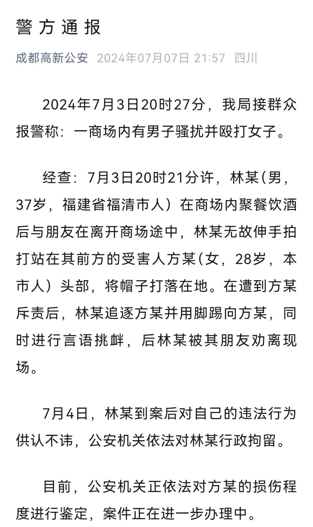 近日,四川成都一女子发视频称在商场遭遇醉酒男子骚扰和殴打,事件引发关注。7月7日晚,成都高新公安发布警方通报↓(人民网四川频道、成都高新公安微信公众号)