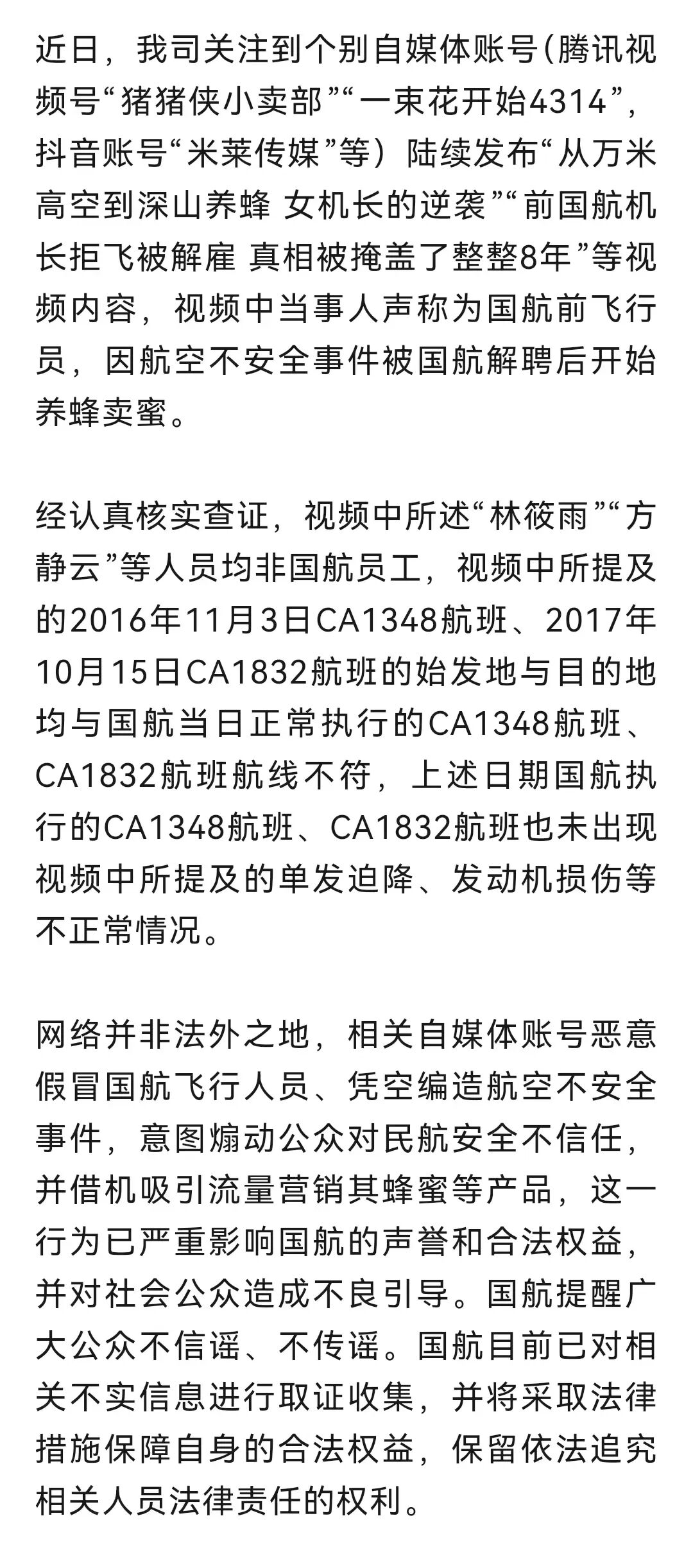 4.假冒飞行员卖蜂蜜,国航发布声明:1月24日,中国国航微信公众号发布《关于个别自媒体账号假冒我司飞行人员发布虚假视频开展营销的声明》,原文如下↓(新华网)