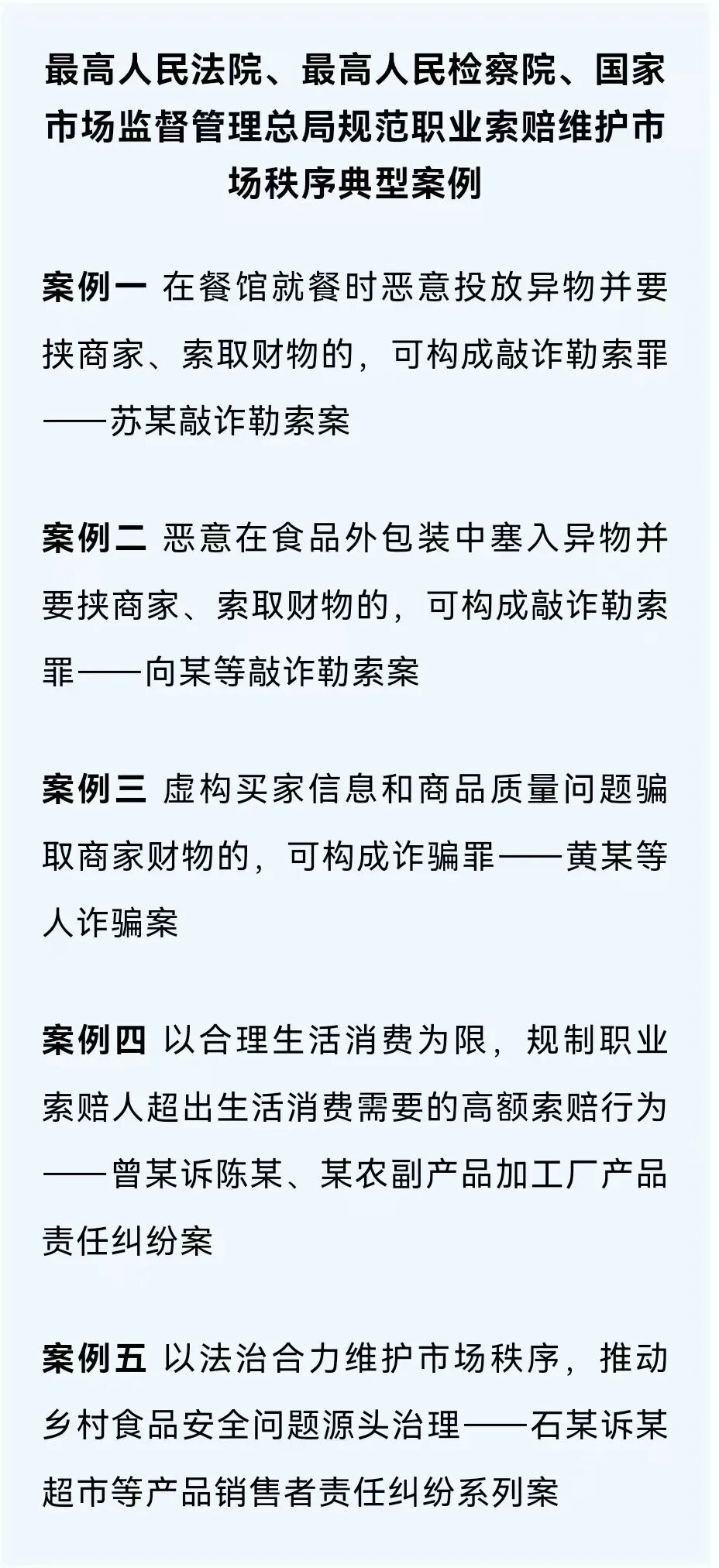 2.最高法、最高检、市场监管总局发布规范职业索赔维护市场秩序典型案例:为充分发挥典型案例的警示、教育和指引作用,1月29日,最高人民法院、最高人民检察院、国家市场监督管理总局联合发布规范职业索赔维护市场秩序典型案例。具体案例如下↓(市说新语)