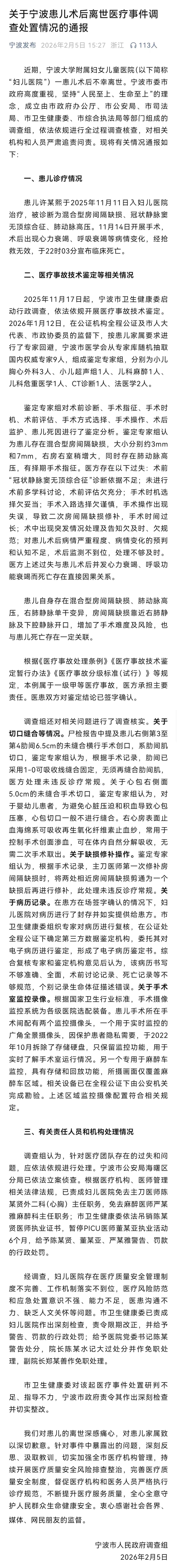近期,宁波大学附属妇女儿童医院一患儿术后不幸离世。宁波市委市政府高度重视,成立多部门组成的调查组,依法依规进行全过程调查核查,于2月5日发布情况通报:医疗事故技术鉴定专家组判定此例属于一级甲等医疗事故,医方承担主要责任,医患双方对鉴定结论已签字确认;宁波市公安局海曙区分局已依法立案侦查;主刀医师陈某贤被免去外二科(心胸)主任职务、吊销医师执业证书,相关涉事医师、医院及领导均受到相应处分处理,市卫生健康委对该起医疗事件处置研判不足、指导不力,被责令作出深刻检查并切实整改。通报如下↓(新华社、宁波发布)
