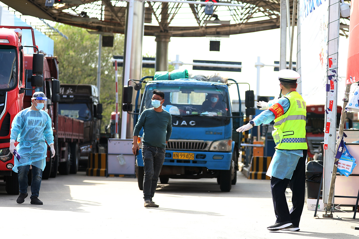 图为4月9日,宜兴市公安局交警大队民警在宜兴西收费站出口引导入宜车辆人员接受查验和进行核酸检测。