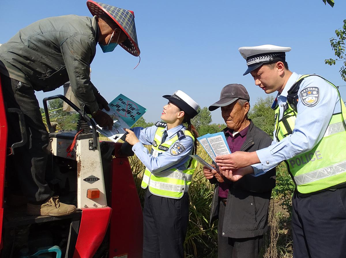 10月9日,安徽省芜湖市公安局交警支队镜湖大队抓住农村秋收季节特点,组织民警走进辖区田间地头开展交通法规宣传,提高群众的交通安全意识。