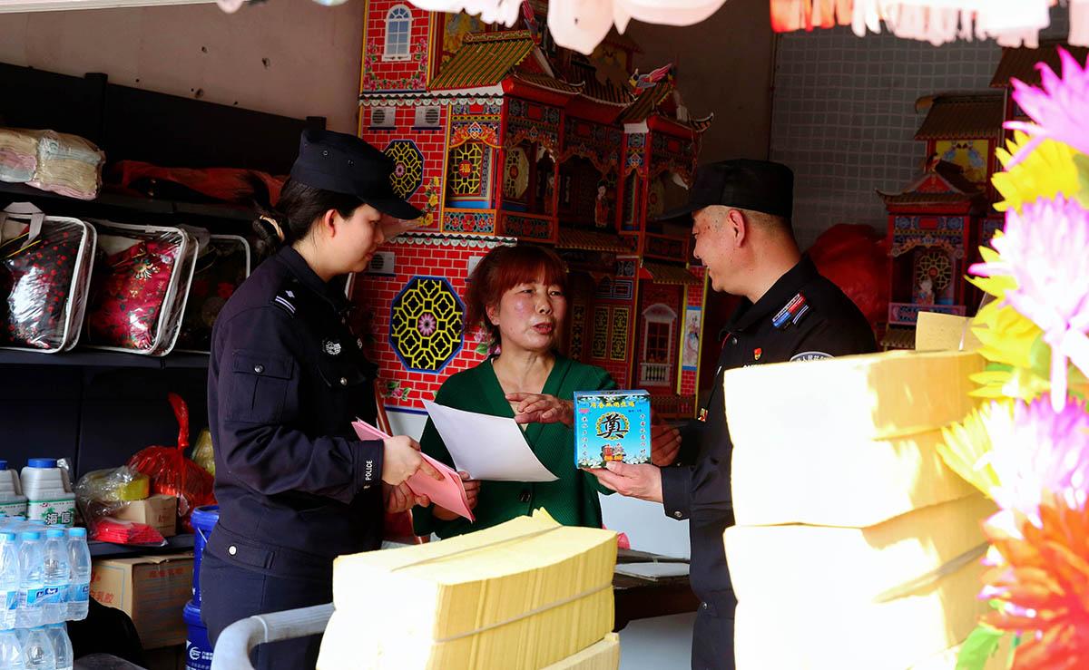 3月30日,广州铁路公安局怀化公安处组织民警深入管辖范围内铁路沿线开展防火宣传,提醒经营烟花爆竹和祭品香火的店铺遵守易燃易爆物品管理规定,确保清明节期间安全。